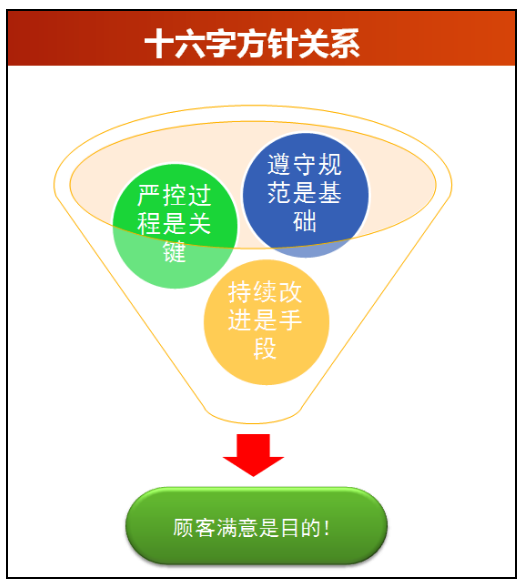 以顧客為中心,滿足顧客的需求和期望是我們組織賴以生存和發(fā)展的基礎(chǔ),也是我們的奮斗目標(biāo),每個(gè)過程、每個(gè)部門都應(yīng)聚焦于滿足顧客需求,為公司的持續(xù)發(fā)展打下良好基礎(chǔ)。顧客不僅包含外部顧客,還包含內(nèi)部顧客,在公司內(nèi)部下道工序是上道工序的顧客,每個(gè)人都應(yīng)樹立“顧客”意識(shí),心懷敬畏之心,致力于滿足用戶的需求,響應(yīng)用戶的需要,主動(dòng)承擔(dān),對(duì)結(jié)果負(fù)責(zé),讓“客戶”滿意、放心。