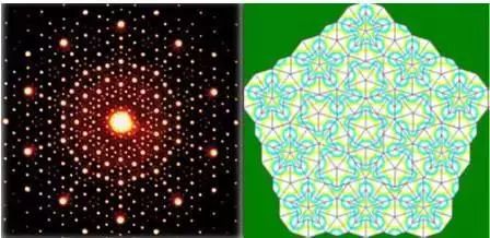 準(zhǔn)晶,是一種介于晶體和非晶體之間的固體,它是由一位叫達(dá)尼埃爾·舍特曼的以色列物理學(xué)家發(fā)現(xiàn)的。1982年4月8日,舍特曼在觀察一種錳鋁合金的時(shí)候,發(fā)現(xiàn)在自己的電子顯微鏡上,出現(xiàn)了一種旋轉(zhuǎn)36°對(duì)稱(chēng)的圖形。沒(méi)過(guò)多久,他又在合金中發(fā)現(xiàn)了一種72°旋轉(zhuǎn)對(duì)稱(chēng)的圖形,類(lèi)似于下面兩幅圖。