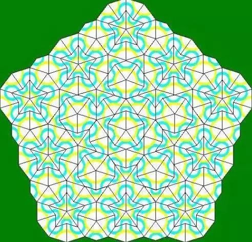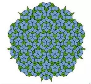 可以看出,很明顯,圖的細(xì)節(jié)上是非周期性的,它確實(shí)不像傳統(tǒng)的晶體模型,能提取一種無(wú)限重復(fù)的圖案。但是整體來(lái)看,它又具有明顯的規(guī)律性。這種由非周期性的圖案鋪滿(mǎn)整個(gè)平面的構(gòu)思,來(lái)自于和舍特曼同時(shí)期的英國(guó)數(shù)學(xué)家彭羅斯。如下圖中,兩種不同的圖形制成的整個(gè)平面的平鋪圖,便是大名鼎鼎的彭羅斯拼圖。彭羅斯拼圖跳出了傳統(tǒng)的正方形拼圖的觀念,巧妙地采用了一系列非周期性的磚組,構(gòu)成了一系列規(guī)則的圖案。這從數(shù)學(xué)的角度,有力地證明了準(zhǔn)晶存在的可能性,肯定了舍特曼的工作。彭羅斯本人也獲得了1988年的沃爾夫獎(jiǎng),這是數(shù)學(xué)界的最高獎(jiǎng)之一。