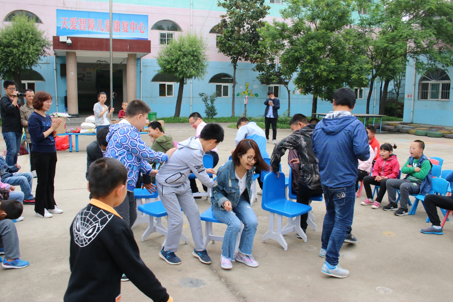 康復(fù)中心的孩子大多是智障、自閉癥患者,這些孩子一般缺少安全感,他們在這里接受系統(tǒng)的康復(fù)訓(xùn)練,主要以培養(yǎng)生活自理能力為主,鍛煉他們將來能自食其力。盡管他們不能像同齡兒童一樣正常交流,“你好”、“坐”……,然后拍拍凳子,這也許就是他們最好的表達(dá),但每一個字、每一個詞都袒露出真誠。孩子們對西安航科志愿者叔叔阿姨們的到來極為高興,基于他們的心理特性,從見到我們的那一刻起,就拉住手一直也不松開。在講解航天知識時,他們把志愿者黃微波叔叔圍在中間,嘰嘰喳喳,好奇的問這問那;在做游戲時,他們歡快的像一個個精靈,搶凳子游戲中,志愿者蔡望和王茜也歡樂的像個孩子,西安航科的叔叔阿姨們和天愛的老師們、同學(xué)們都沉浸在了歡樂的海洋中。