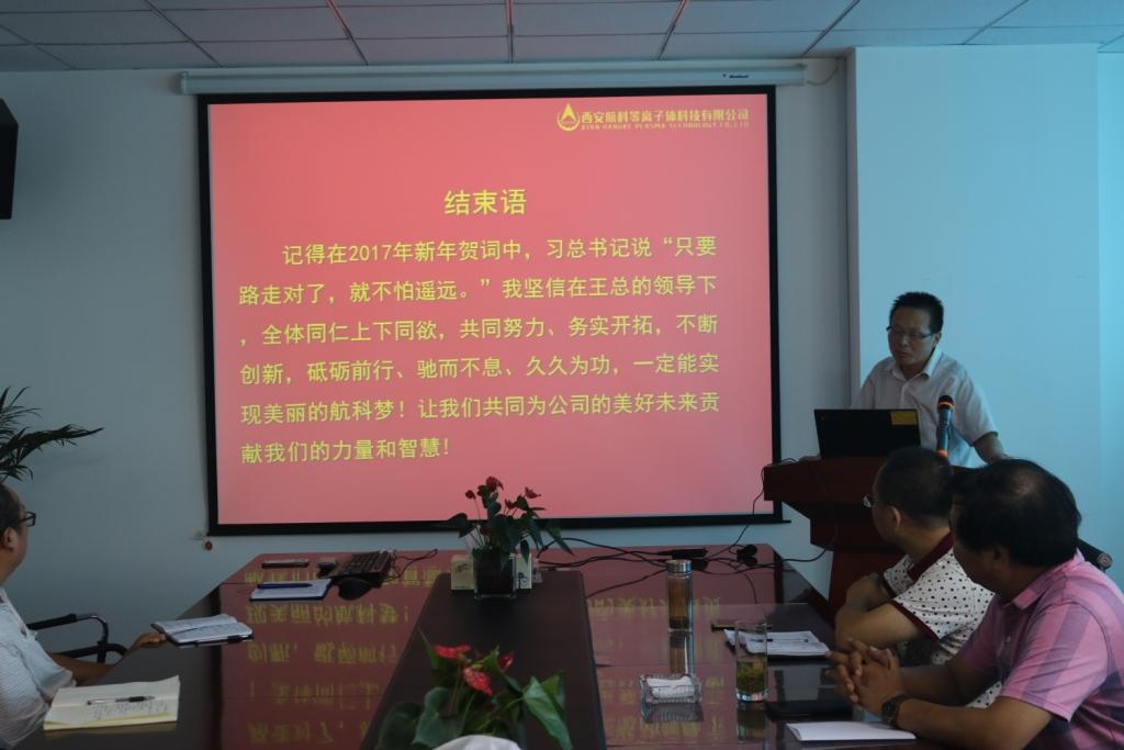 最后董事長王浩靜做了總結(jié)性的講話,他充分肯定了公司上半年所取得成績,航科人圍繞公司的“1 + 1 + 0.5”產(chǎn)品研發(fā)戰(zhàn)略,在等離子體專業(yè)領(lǐng)域取得的創(chuàng)新性的突破,實(shí)現(xiàn)國內(nèi)領(lǐng)先;其他領(lǐng)域也實(shí)現(xiàn)了大踏步的邁進(jìn),這一切離不開大家的共同努力;展望未來的152天,王總要求我們堅(jiān)定公司的發(fā)展方向,快速推動(dòng)軍民融合,秉持公司“創(chuàng)新一代 研發(fā)一代 儲(chǔ)備一代 生產(chǎn)一代 服務(wù)一代”的發(fā)展原則,做好新“2.5”,穩(wěn)步促進(jìn)預(yù)研項(xiàng)目;上半年已經(jīng)匆匆而過,他提出一個(gè)創(chuàng)業(yè)型企業(yè)要做什么?作為我們公司,應(yīng)該快速促進(jìn)技術(shù)轉(zhuǎn)化,用有限的資源,做合理的布局,爭取產(chǎn)品的市場化。他希望下半年從組織架構(gòu)和人員配備、管理制度提升、統(tǒng)一思想和優(yōu)勝劣汰、解放思想和適應(yīng)市場發(fā)展、激勵(lì)政策等方面對公司的管理進(jìn)一步提升;各職能部門應(yīng)主動(dòng)作為,研發(fā)人員團(tuán)結(jié)協(xié)作,實(shí)現(xiàn)航科的跨越。