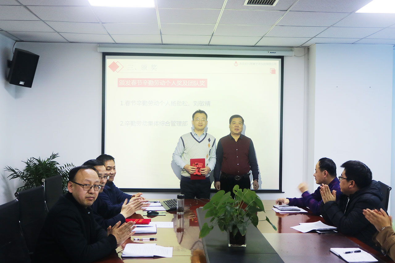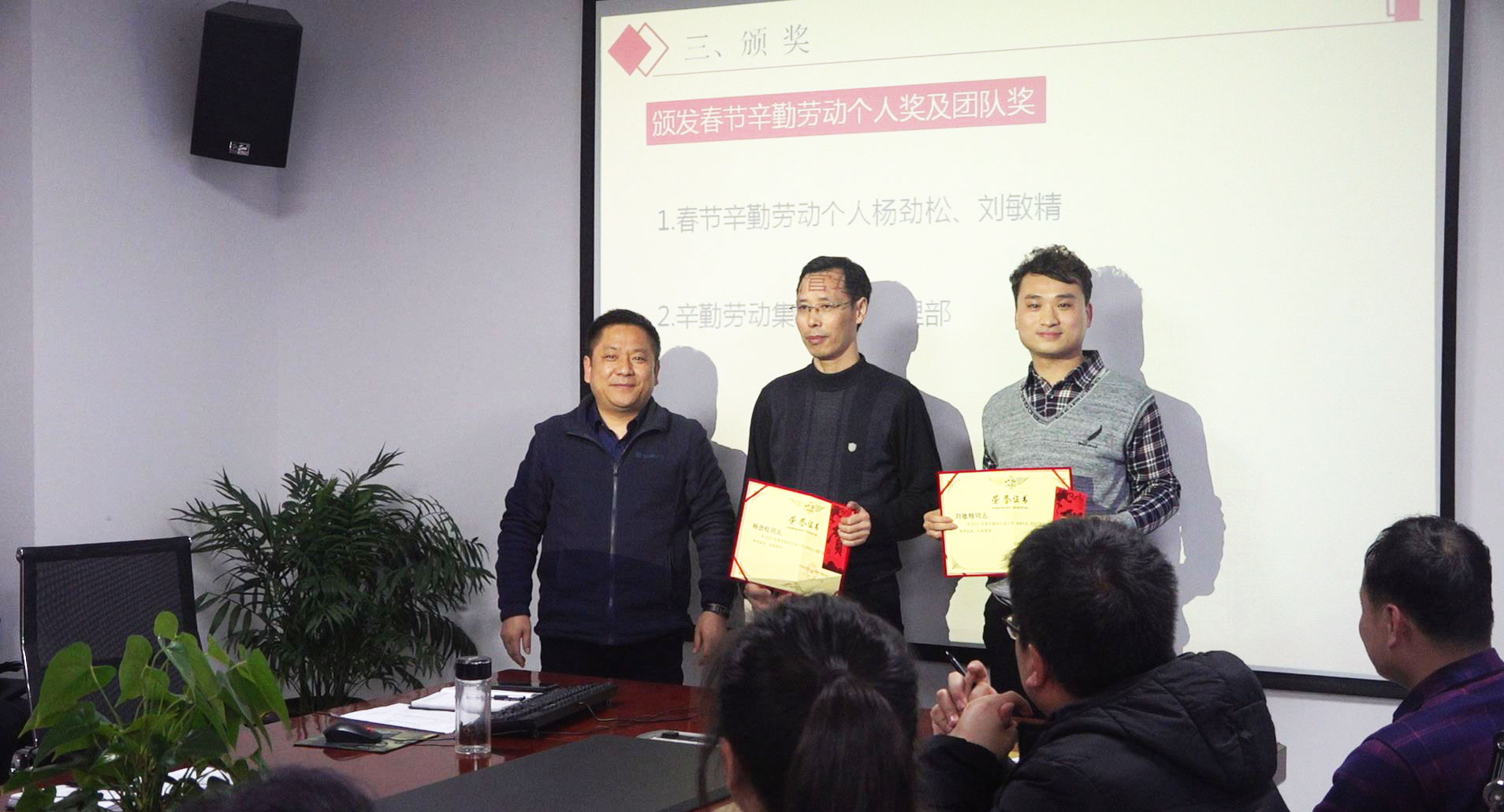 再次,公司對(duì)春節(jié)期間仍在崗工作和學(xué)習(xí)的研發(fā)部04項(xiàng)目總師楊勁松、綜合管理部人資主管劉敏精和辛勤勞動(dòng)集體予以表彰,副總經(jīng)理?xiàng)罾h給個(gè)人頒發(fā)榮譽(yù)證書和獎(jiǎng)金。公司領(lǐng)導(dǎo)對(duì)綜合管理部予以表彰,表?yè)P(yáng)綜合管理部一直兢兢業(yè)業(yè)的為大家服務(wù),配合項(xiàng)目工作,評(píng)為辛勤勞動(dòng)集體;